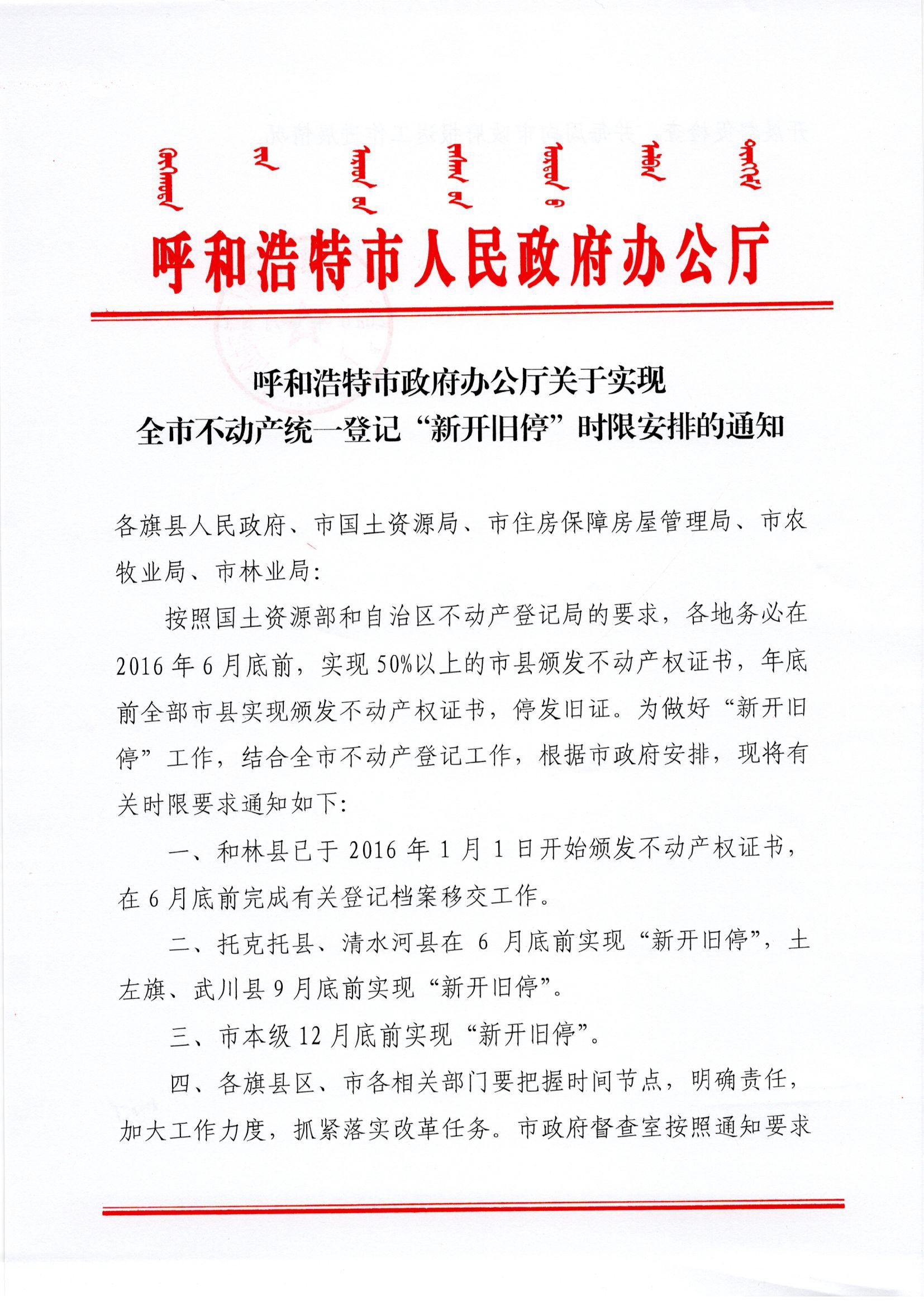 呼和浩特市政府办公厅关于实现全市不动产统一登记“新开旧停”时限安排的通知